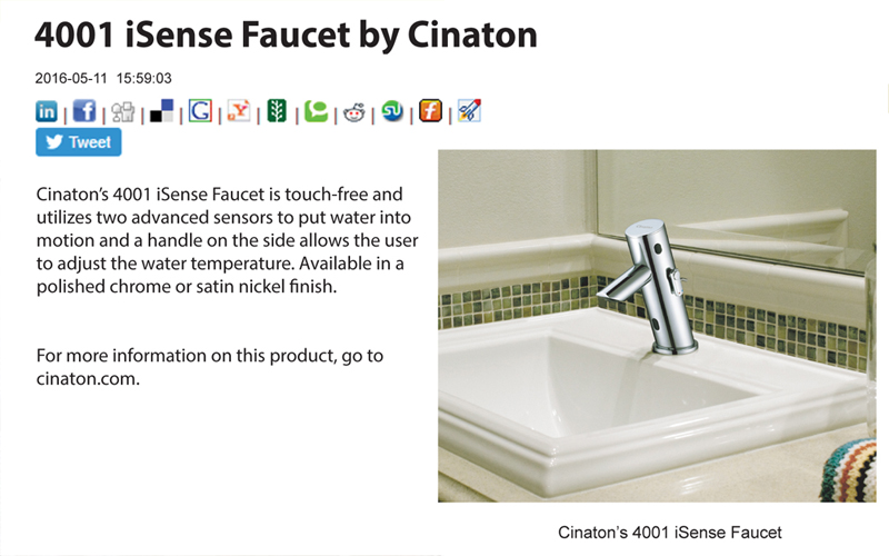 Cinaton's 4001 iSense Faucet is touch-free and utilizes two advanced sensors to put water into motion and a handle on the side allows the user to adjust the water temperature. Available in a polished chrome or satin nickel finish.