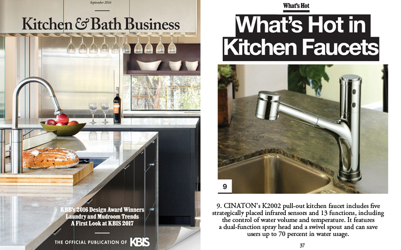 CINATON's K2002 pull-out kitchen faucet includes five strategically placed infrared sensors and 13 functions, including the control of water volume and temperature. It features a dual-function spray head and a swivel spout and can save users up to 70 percent in water usage.
