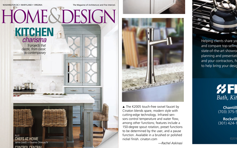 The K2005 touch-free swivel faucet by Cinaton blends spare, modern style with cutting-edge technology. Infrared sensors control temperature and water flow, among other functions; features include a 150-degree spout rotation, preset functions to be determined by the user, and a pause function. Available in a brushed or polished nickel finish. cinaton.com.