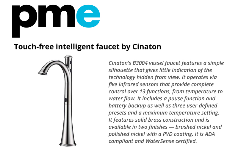 Cinaton?s B3004 vessel faucet features a simple silhouette that gives little indication of the technology hidden from view. It operates via five infrared sensors that provide complete control over 13 functions, from temperature to water flow. It includes a pause function and battery-backup as well as three user-defined presets and a maximum temperature setting. It features solid brass construction and is available in two finishes ? brushed nickel and polished nickel with a PVD coating. It is ADA compliant and WaterSense certified.